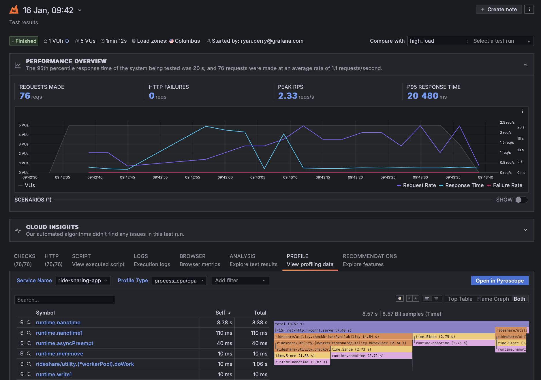 - Visualize in Grafana Cloud: Use the Grafana Cloud k6 UI to see profiling data directly paired with your test metrics and link back to Grafana Cloud Profiles for deeper analysis.