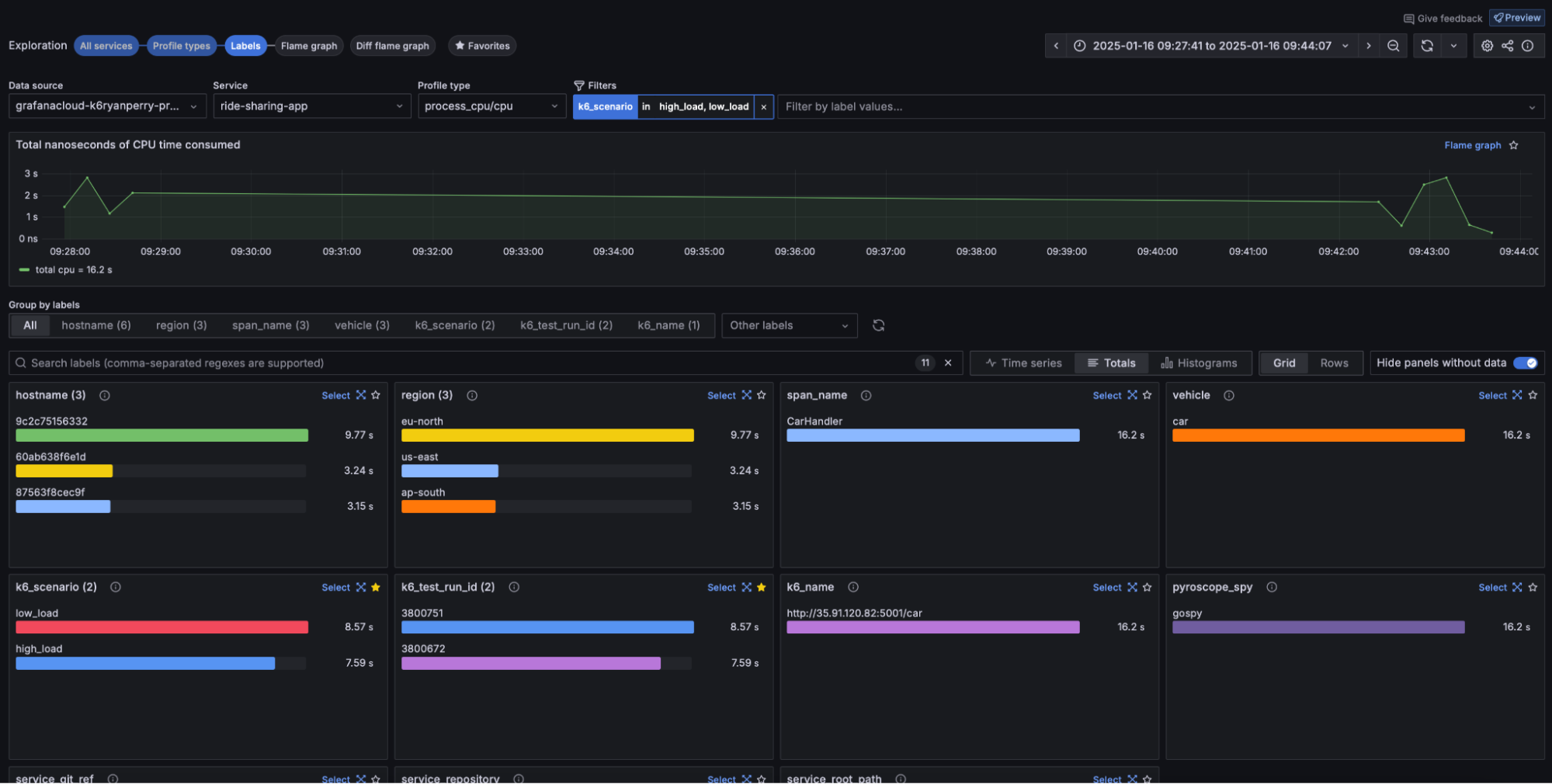 1. Understand code performance in context: When Grafana Cloud k6 sends annotated test data, Pyroscope client-side instrumentation adds labels to your profiling data. This means you can correlate specific test scenarios with CPU bottlenecks, memory spikes, or inefficient function calls.