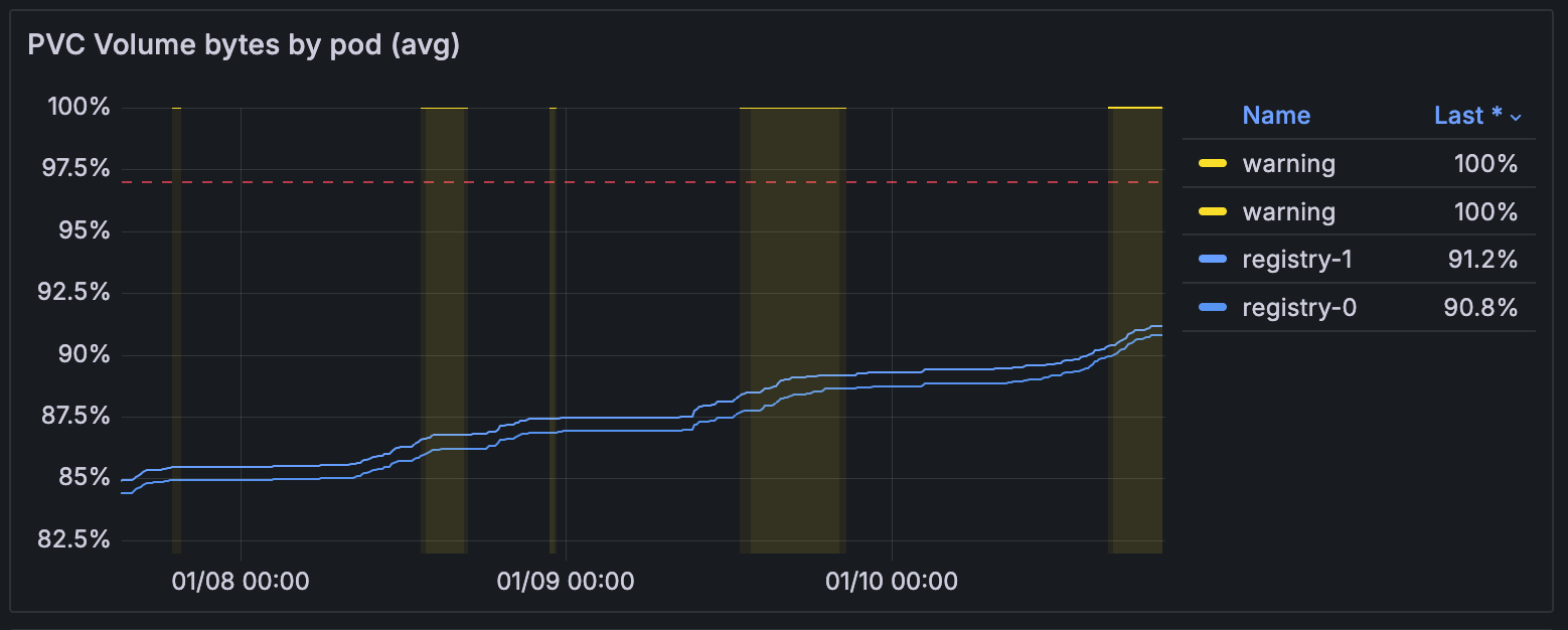 In the screenshot above, we’re showing the “PVC Volume bytes by pod (avg)” panel for a StatefulSet with two replicas. It looks like both of the pods in this workload have volumes with intermittent warning alerts. If I look at the first pod, registry-0, I can see it’s the KubePersistentVolumeFillingUp alert. This alert has two severities: warning and critical. The critical threshold is 97%, so this is plotted on the chart as the red dashed line—and we’re not there, yet.