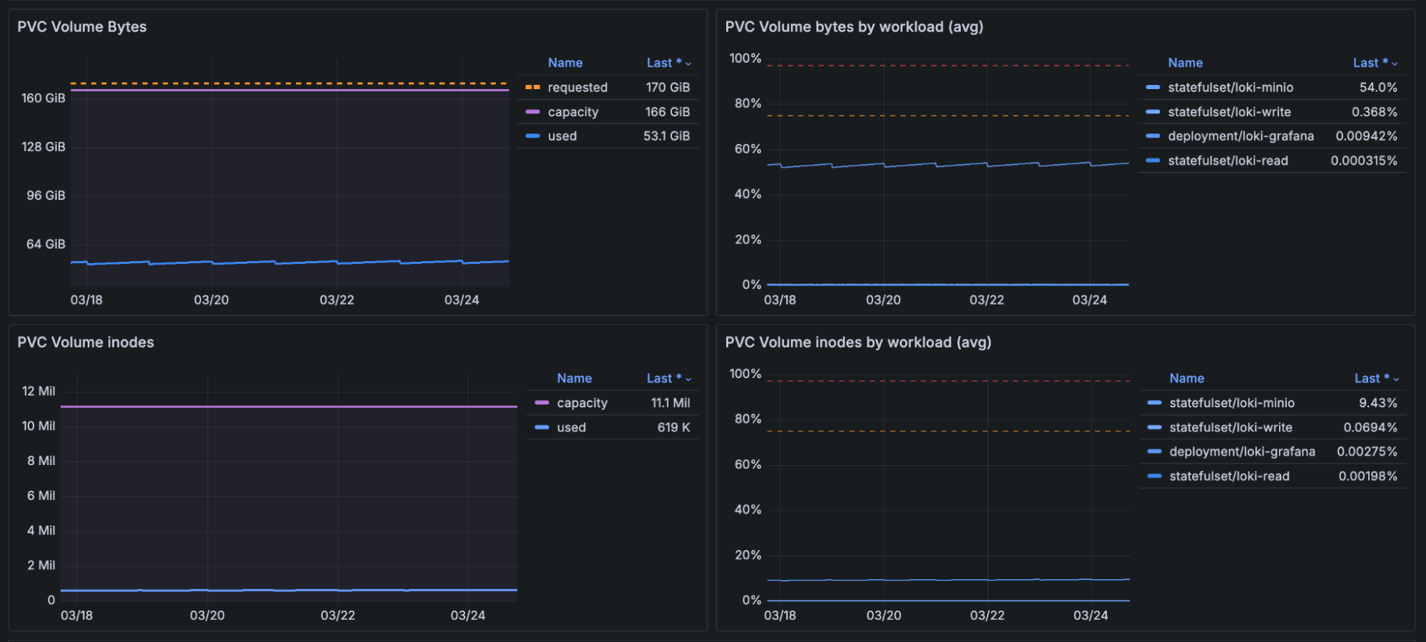 This means, depending on which level you choose to view your storage from, you can see everything from which pod in a multi-replica workload has volumes close to capacity, through to namespace-averaged volume usage, or even the total provisioned volume capacity across an entire cluster.