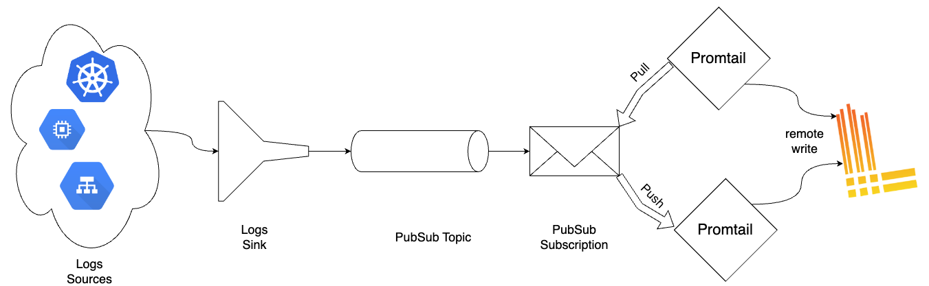 - Pull-based subscription: Promtail pulls log entries from a GCP PubSub topic