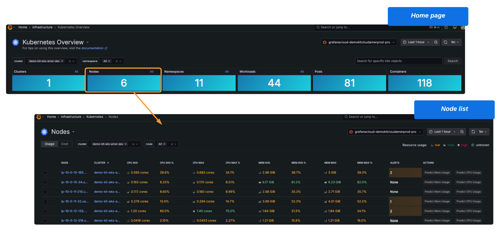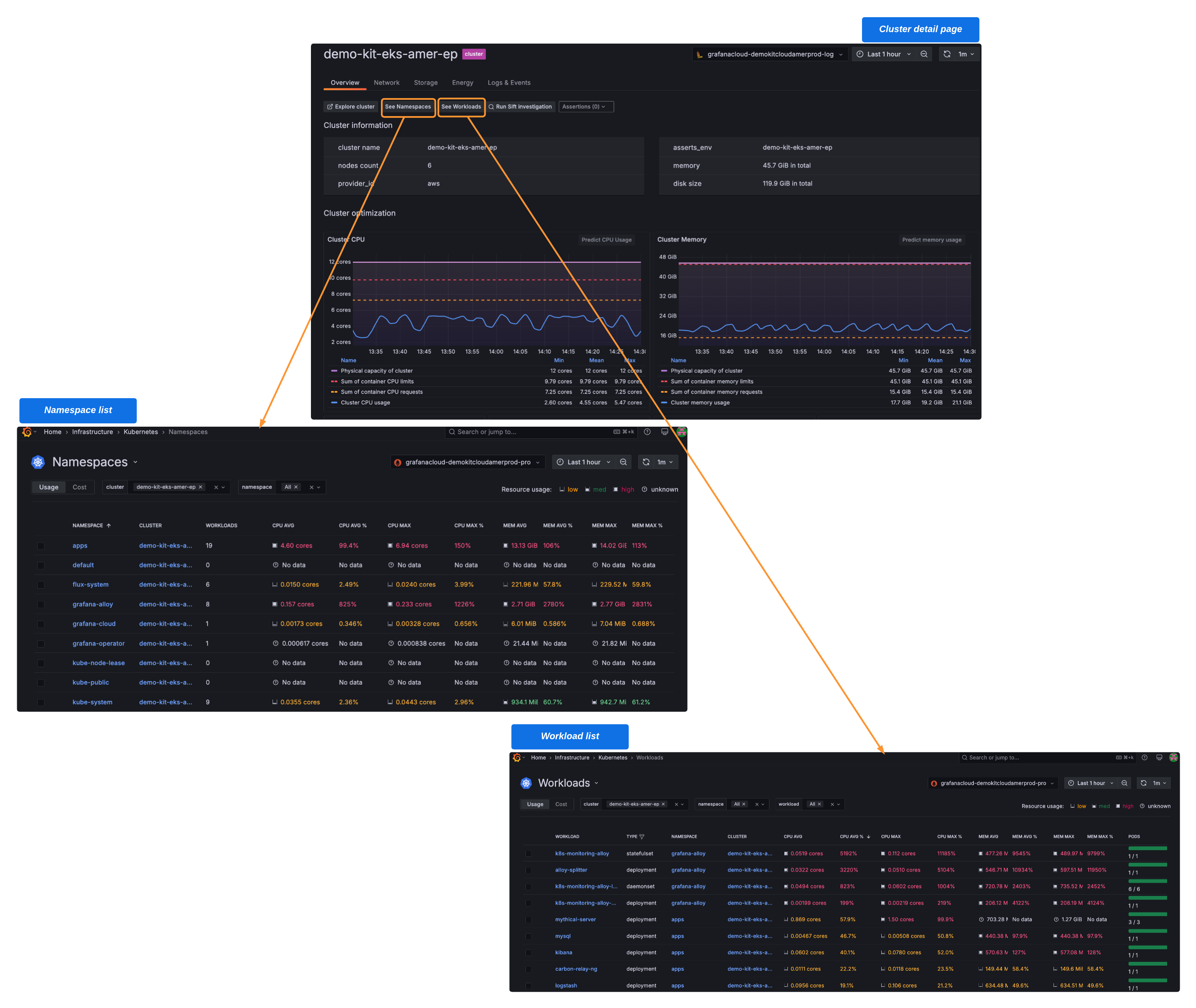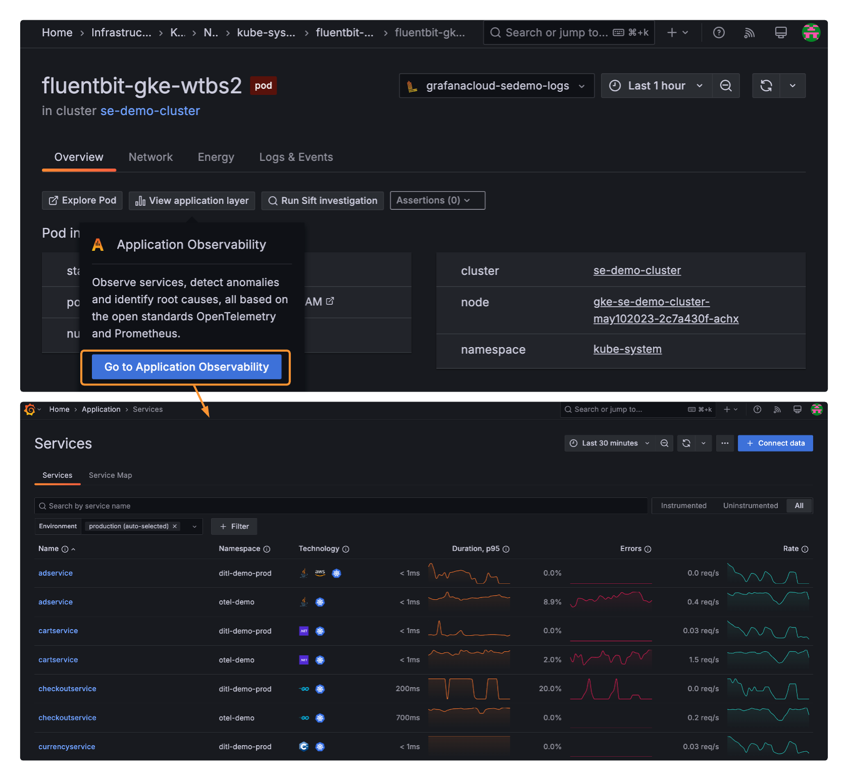 Navigate easily from Kubernetes Monitoring to other capabilities in Grafana Cloud to analyze, troubleshoot, and solve issues.