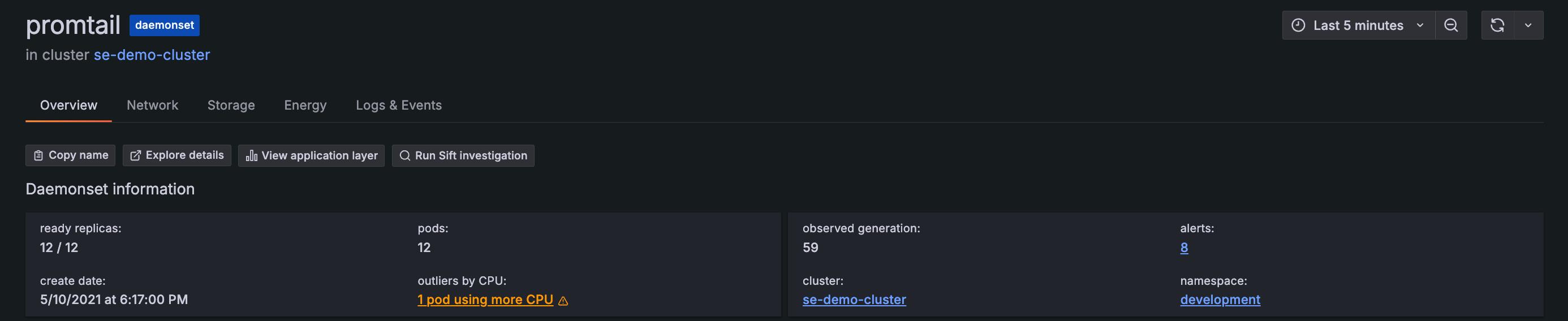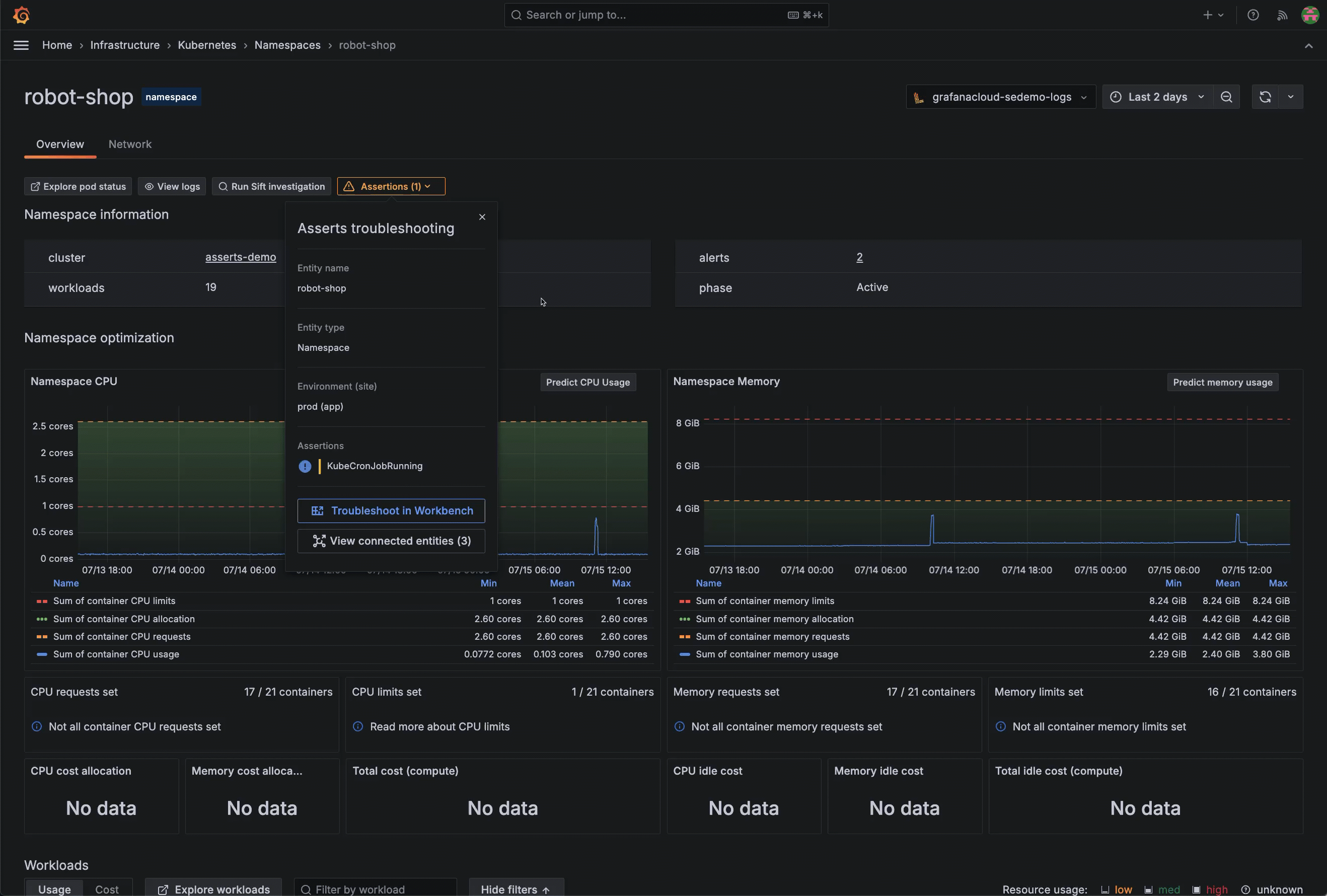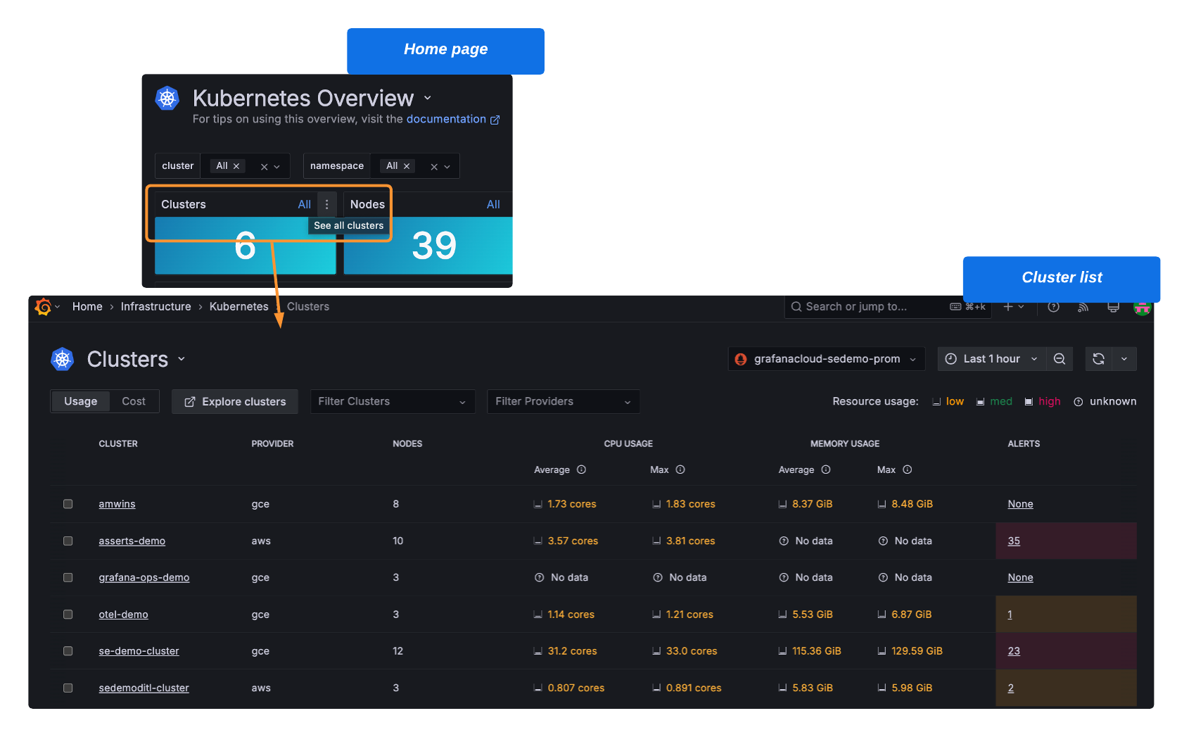 Navigate easily from Kubernetes Monitoring to other capabilities in Grafana Cloud to analyze, troubleshoot, and solve issues.