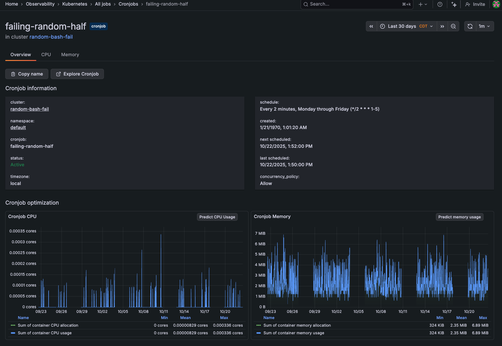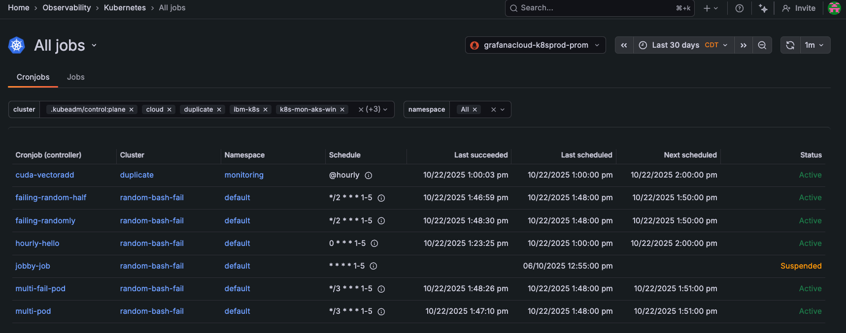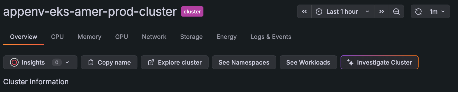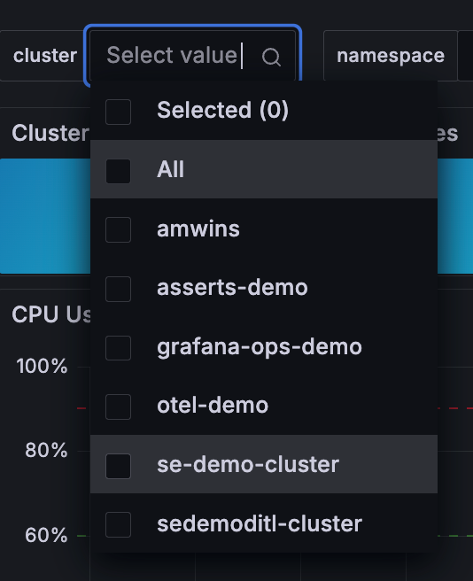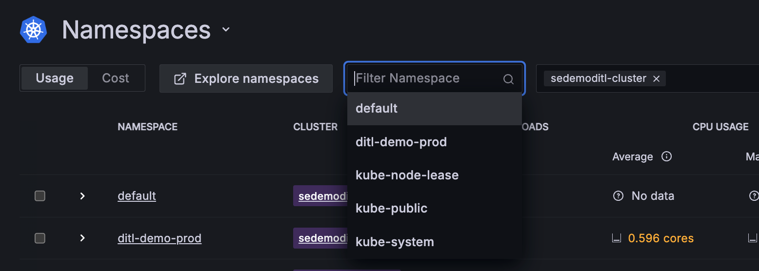 Adjust the time range and filter by Cluster and namespace to narrow and include historical data for: