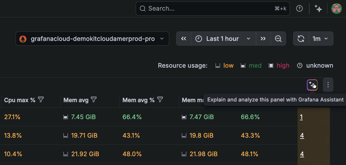 Click on the Grafana Assistant icon in any panel that contains it to learn more about the panel. This feature opens the Assistant window where you can ask additional questions about the panel itself or your data displayed in the panel.