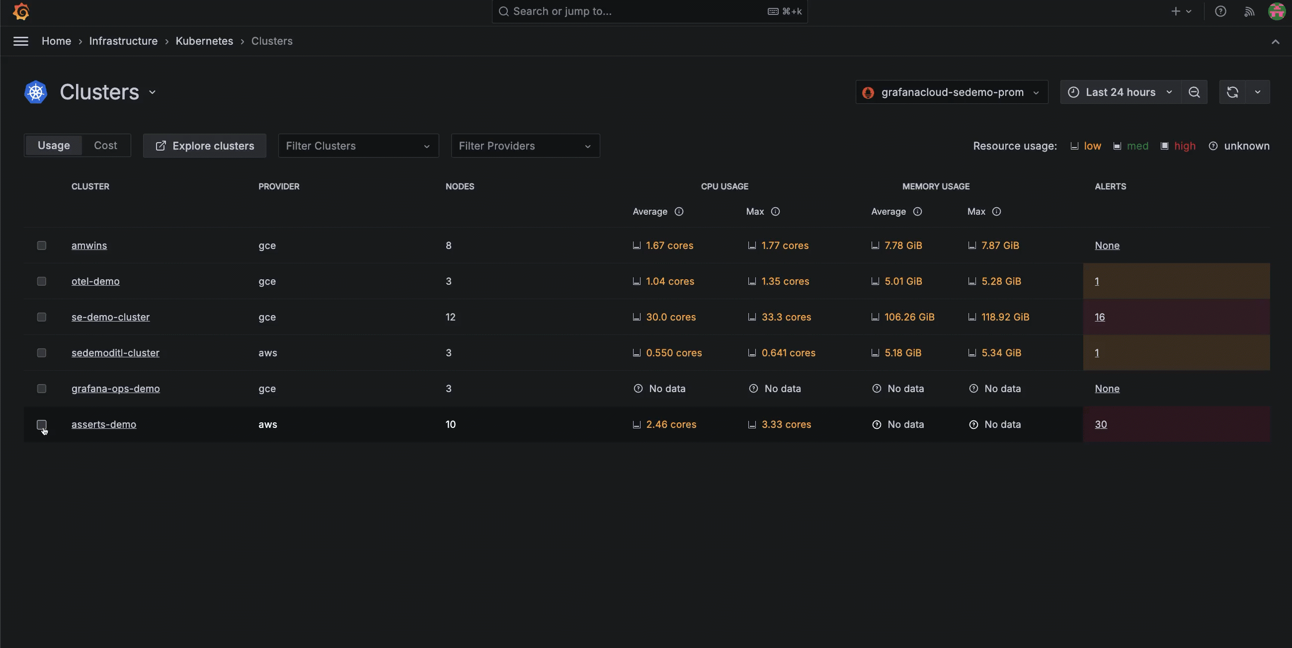 The Kubernetes Overview page gives you a high-level view of your Clusters, usage, and alerts. This page brings to the forefront key data about your infrastructure.