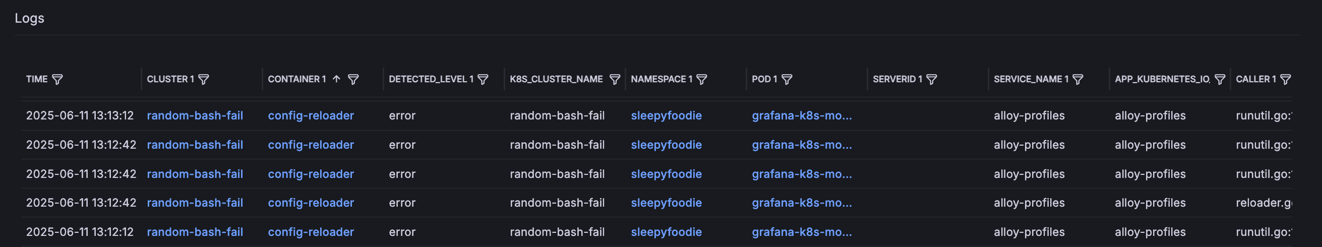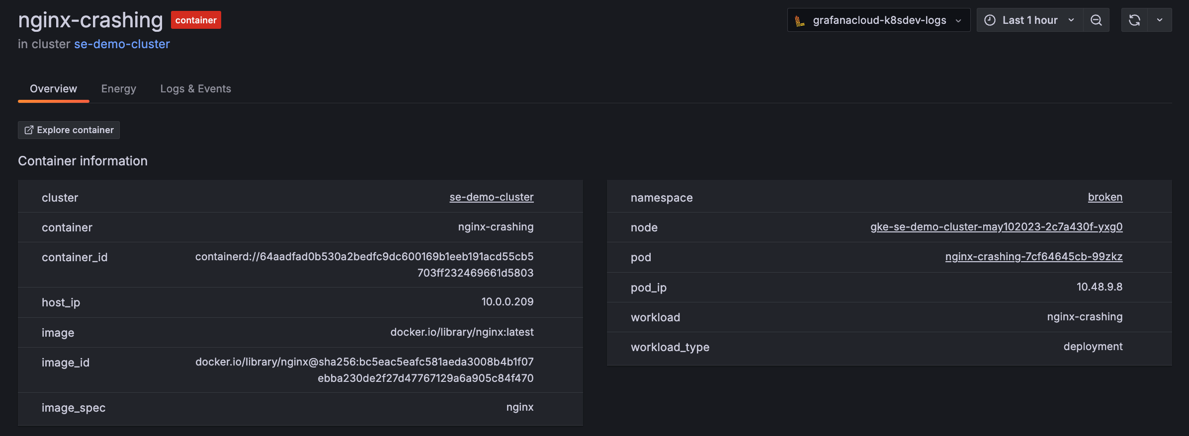 From any detail page, click the Logs & Events tab to view the logs and events for that Kubernetes object. You can filter for many dimensions, including:
