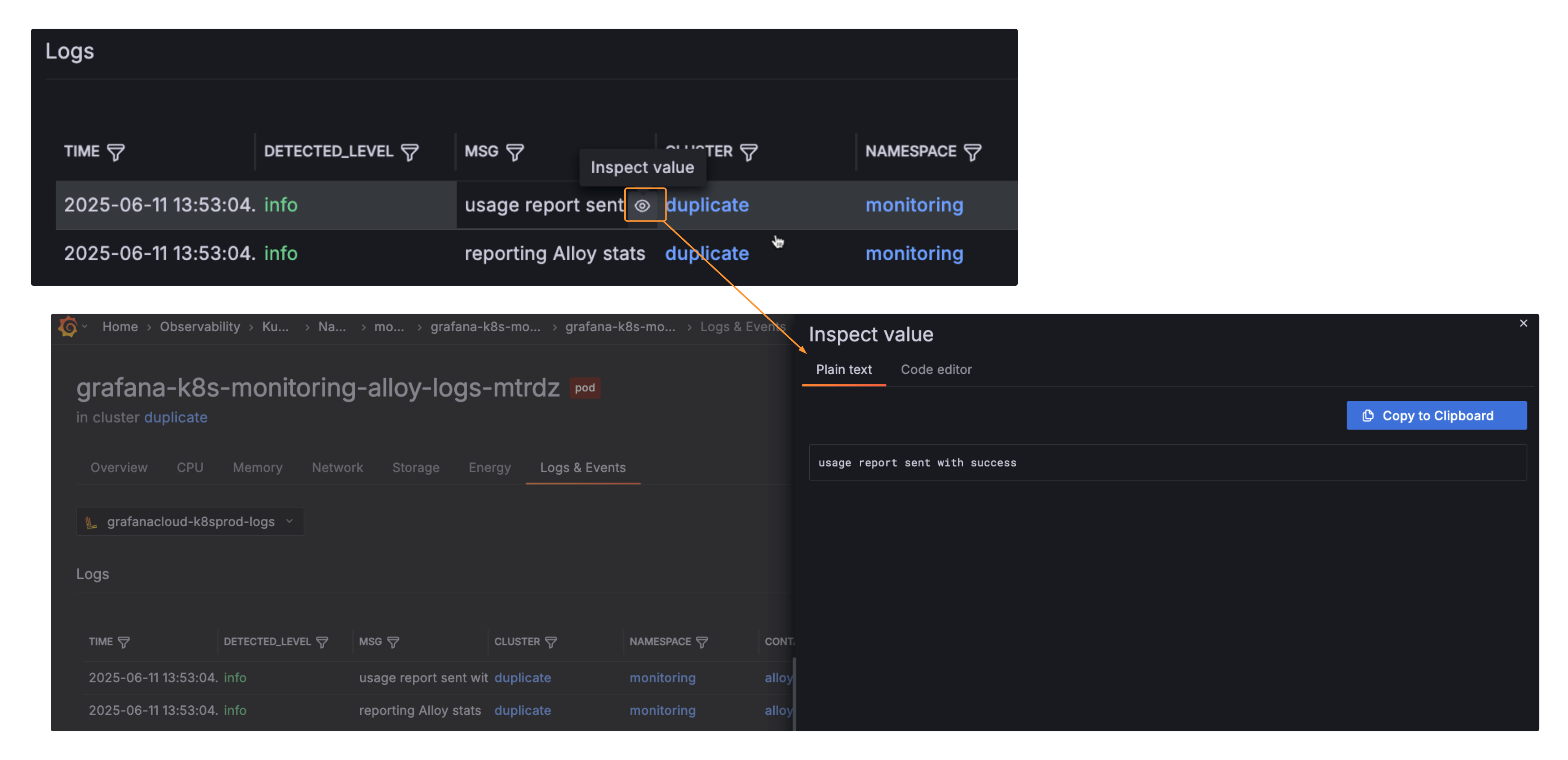 To see a longer message in the Logs table, hover over the item and click the Inspect value (eye) icon to see the complete message.