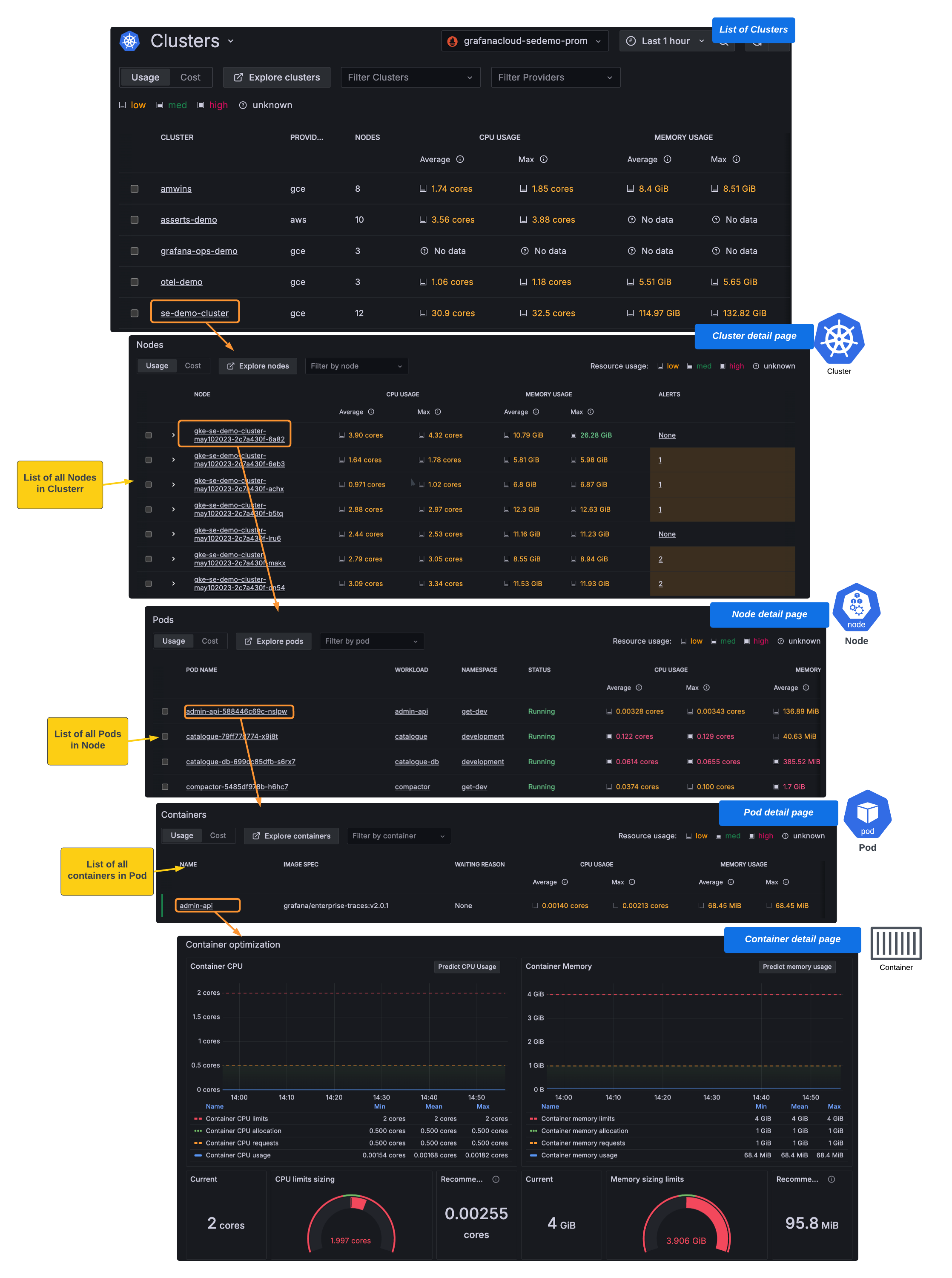 Kubernetes Monitoring pages reflect the hierarchy of Kubernetes objects, so you can begin at any level above containers. Main pages include lists of Clusters, namespaces, workloads, and Nodes.