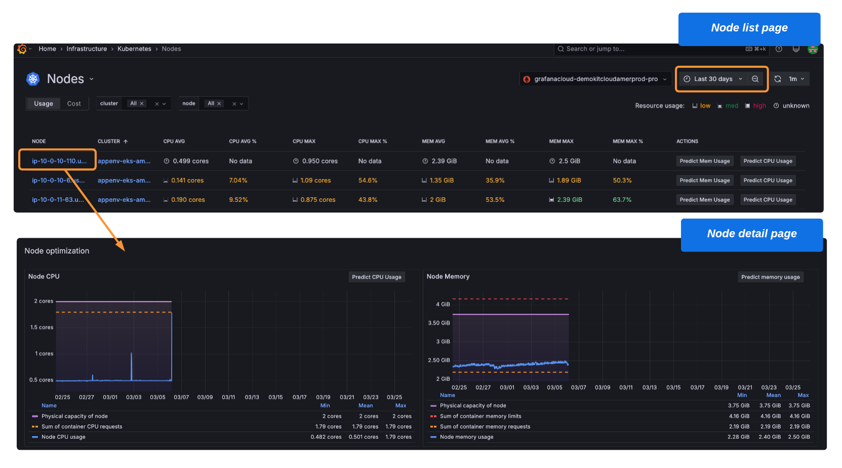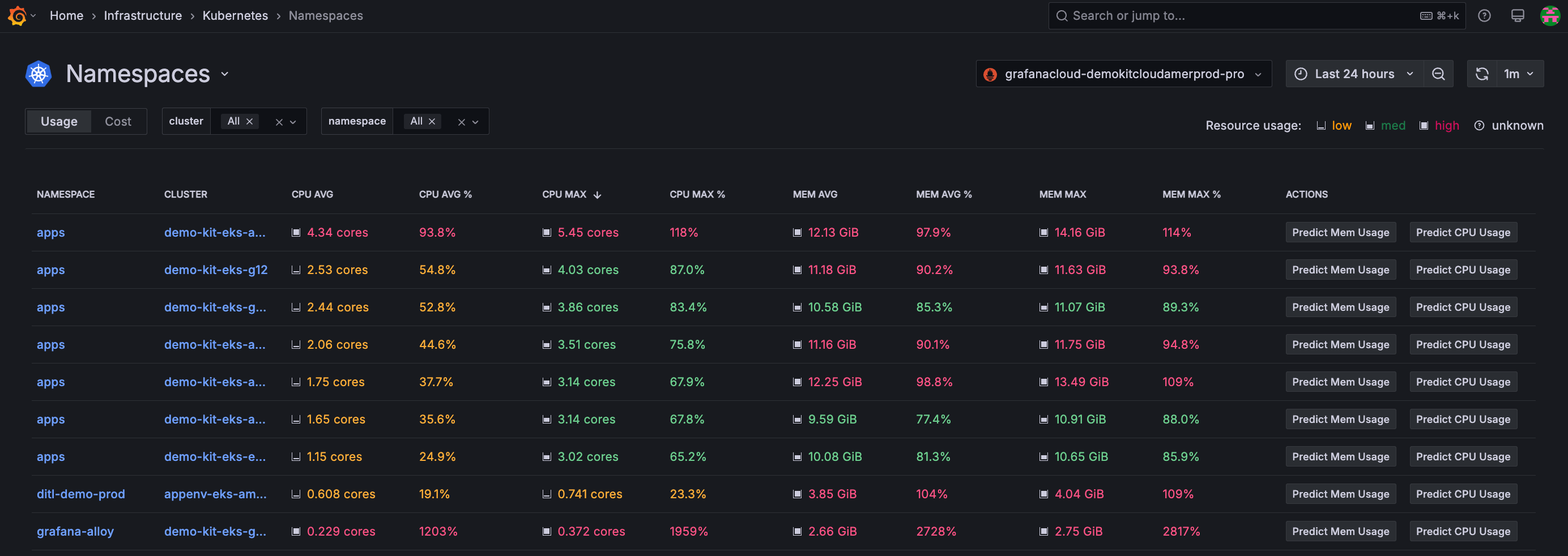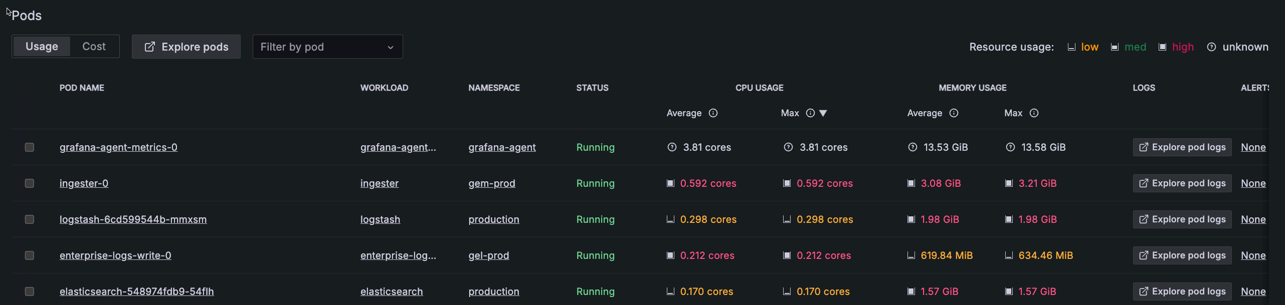 Throughout Kubernetes Monitoring, resource usage statistics are available for Kubernetes objects.