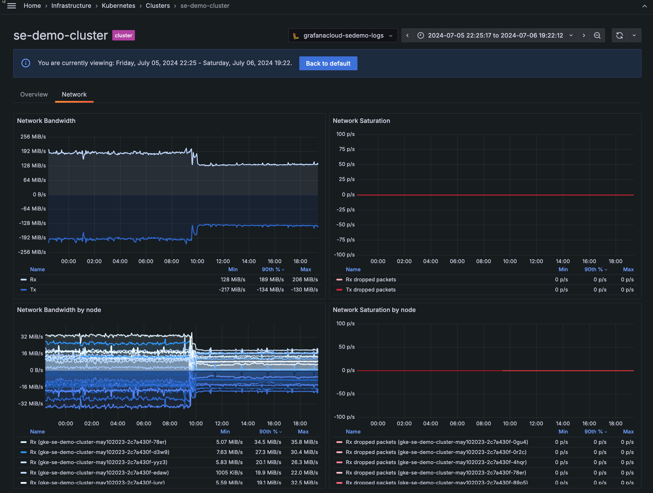 Use the network panels to understand when bandwidth limits are causing network saturation, which can lead to dropped packets. On any detail page for Cluster, namespace, workload, Node, or Pod, click the Network tab to view: