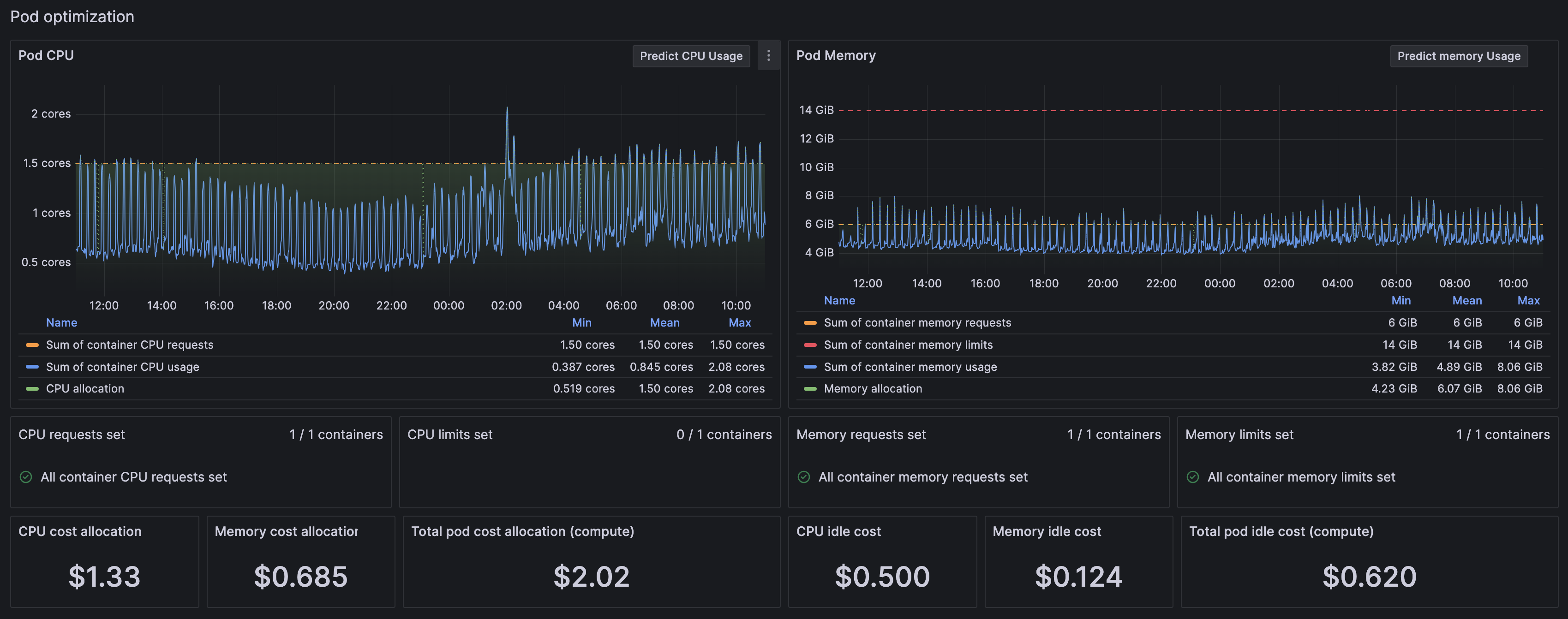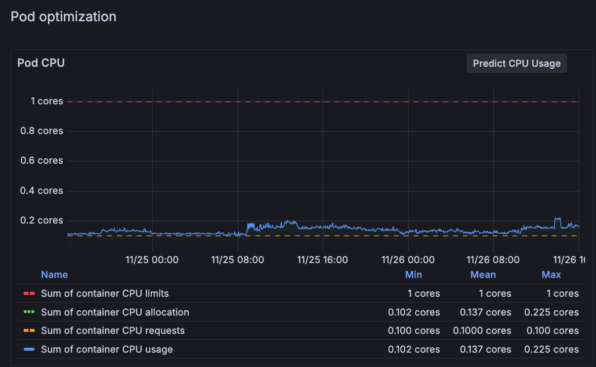 The following buttons are available in various views. Click them to show a prediction for Clusters, namespaces, workloads, Nodes, Pods, and containers. The time range you select must be at least two hours to use these prediction tools: