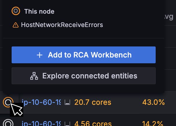 You can take troubleshooting deeper by understanding relationships between components and what is occurring between them. Within Kubernetes Monitoring, access RCA Workbench to perform root cause analysis.