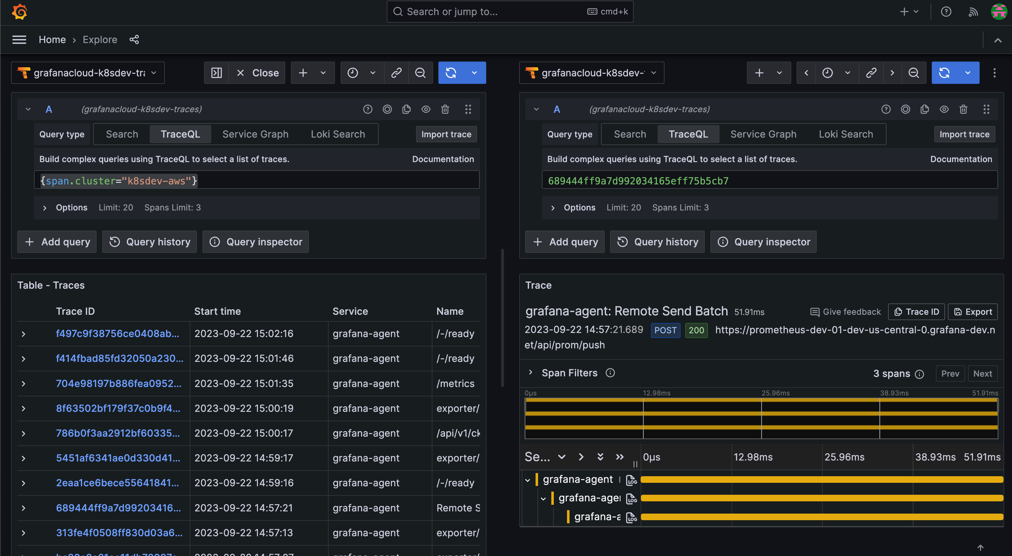 Explore detail page showing table of traces, TraceQL query, and trace graph