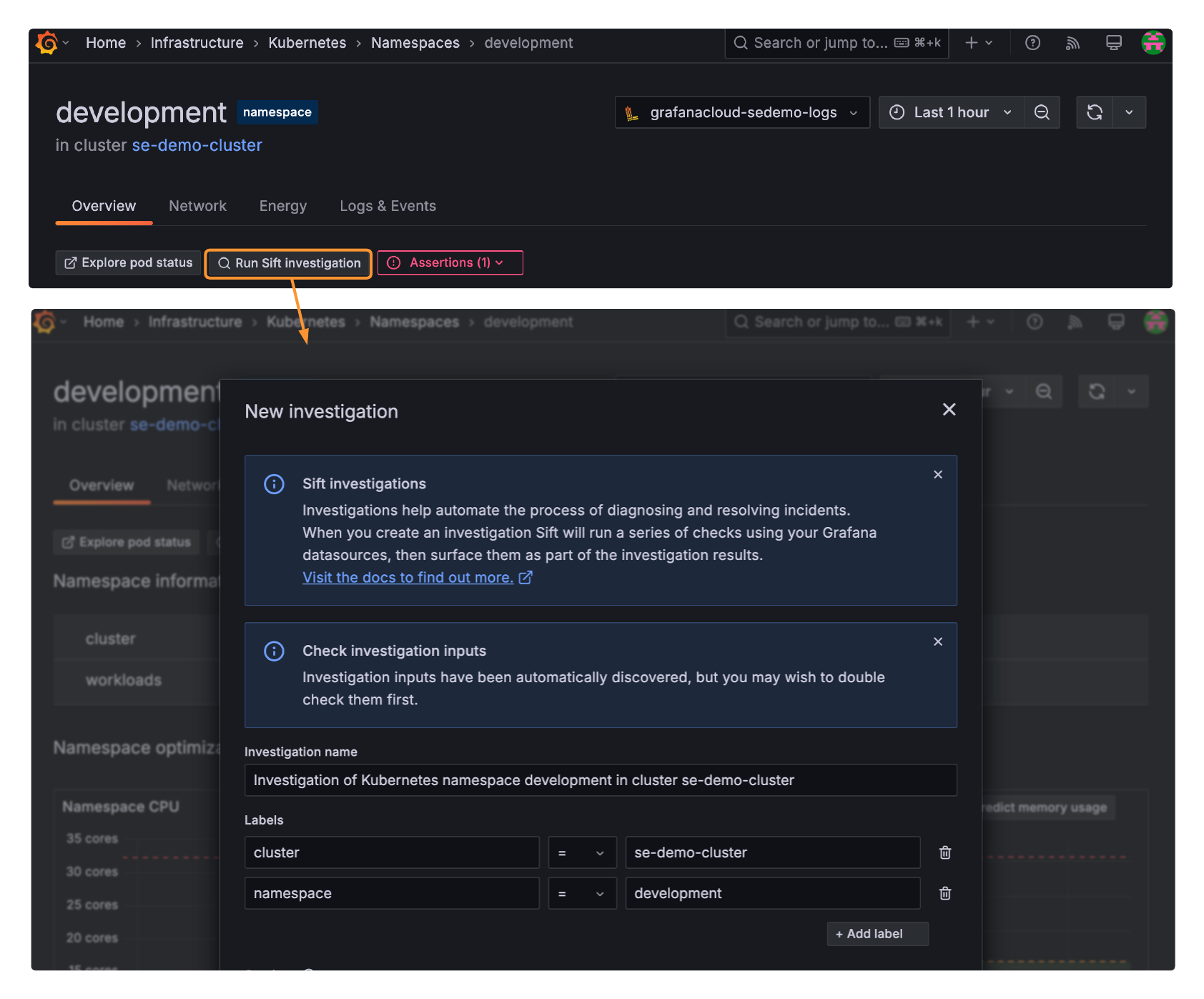 From a Pod, Cluster, namespace, or workload detail page, you can begin an automated investigation by clicking Run Sift investigation. Sift performs a set of automated system checks, and surfaces potential issues in your Kubernetes environment. It then works to identify the root cause of an incident.