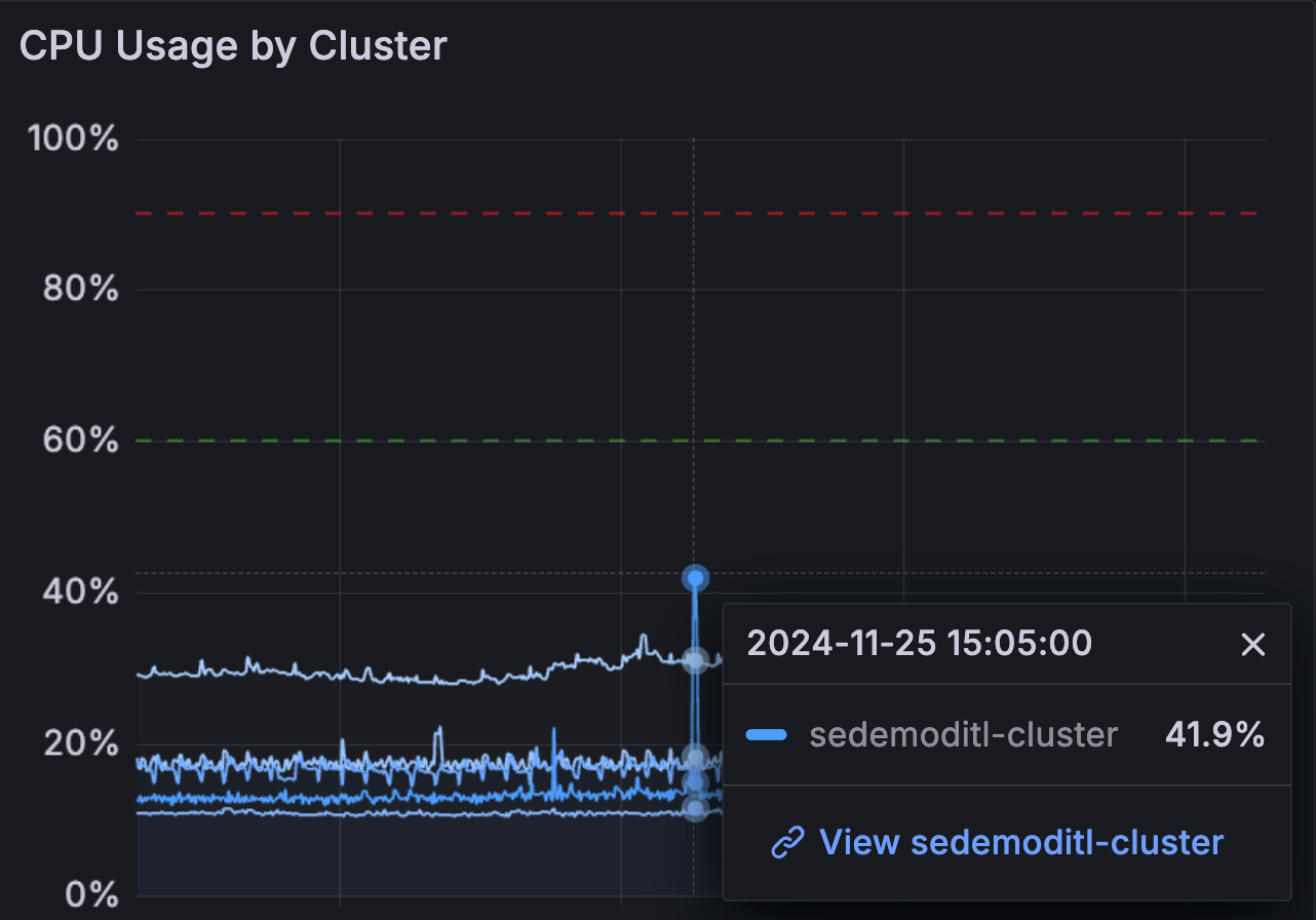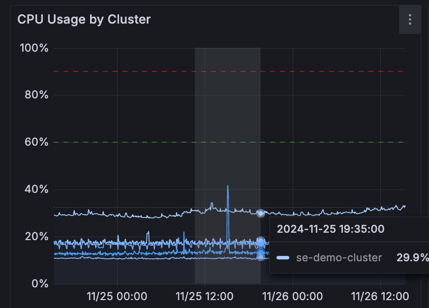 Use the time range selector to focus on a time period while looking for patterns or spikes in CPU and memory usage in your Clusters. When spikes occur:
