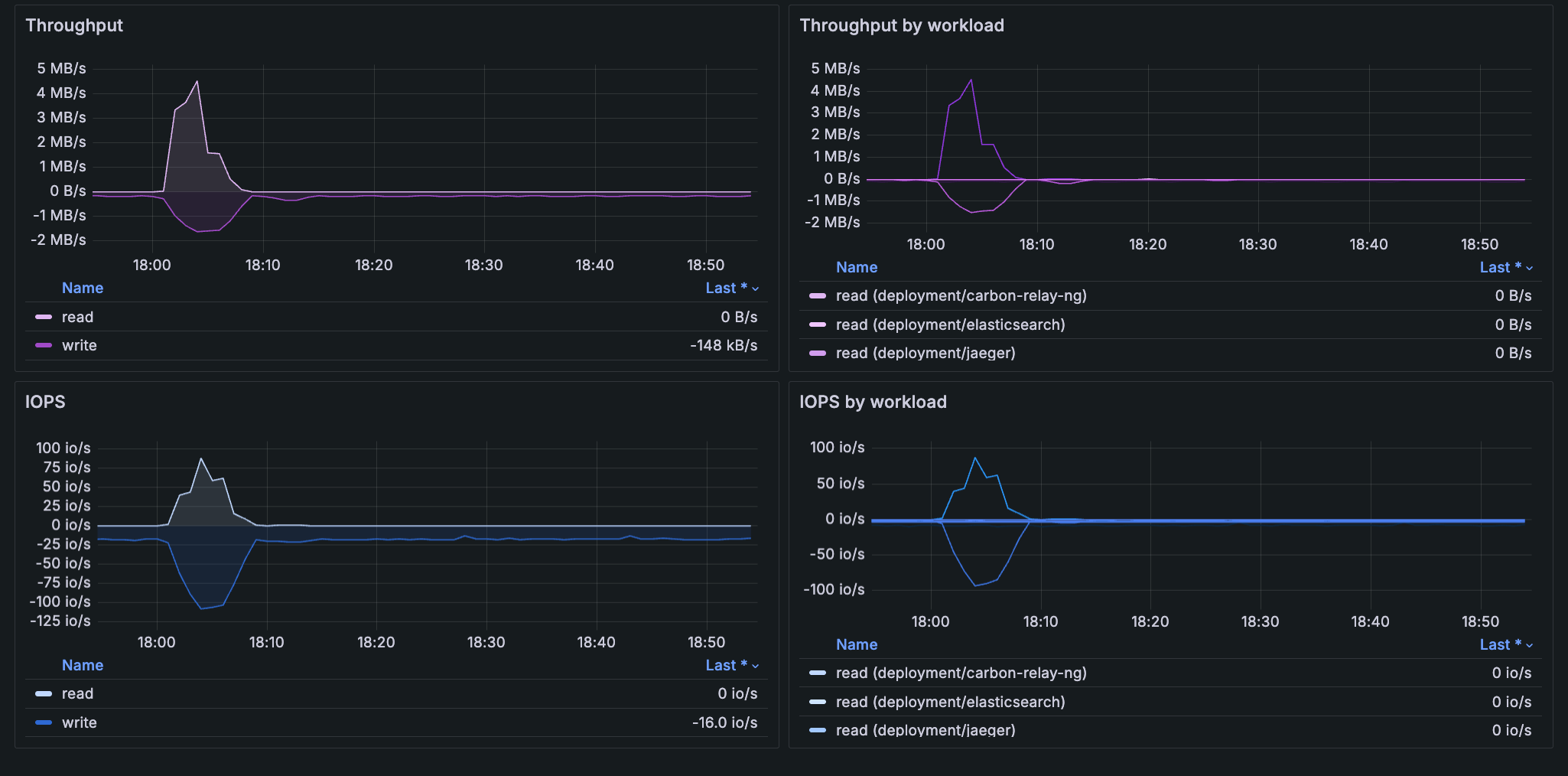 Graphs of throughput and IOPS for a namespace and by workloads within the namespace