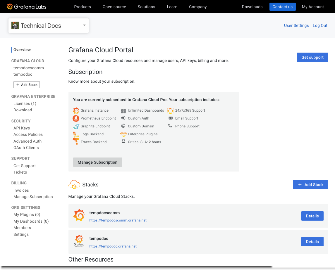 The rest of this page explains the features of the Cloud Portal. What you are able to see and do depends on the permissions granted to your Grafana.com user account. For more information, refer to Grafana Cloud user roles and permissions.