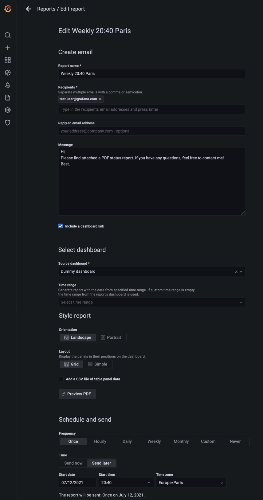 Reporting allows you to automatically generate PDFs from any of your dashboards and have Grafana email them to interested parties on a schedule. This is available in Grafana Cloud Pro and Advanced and in Grafana Enterprise.
