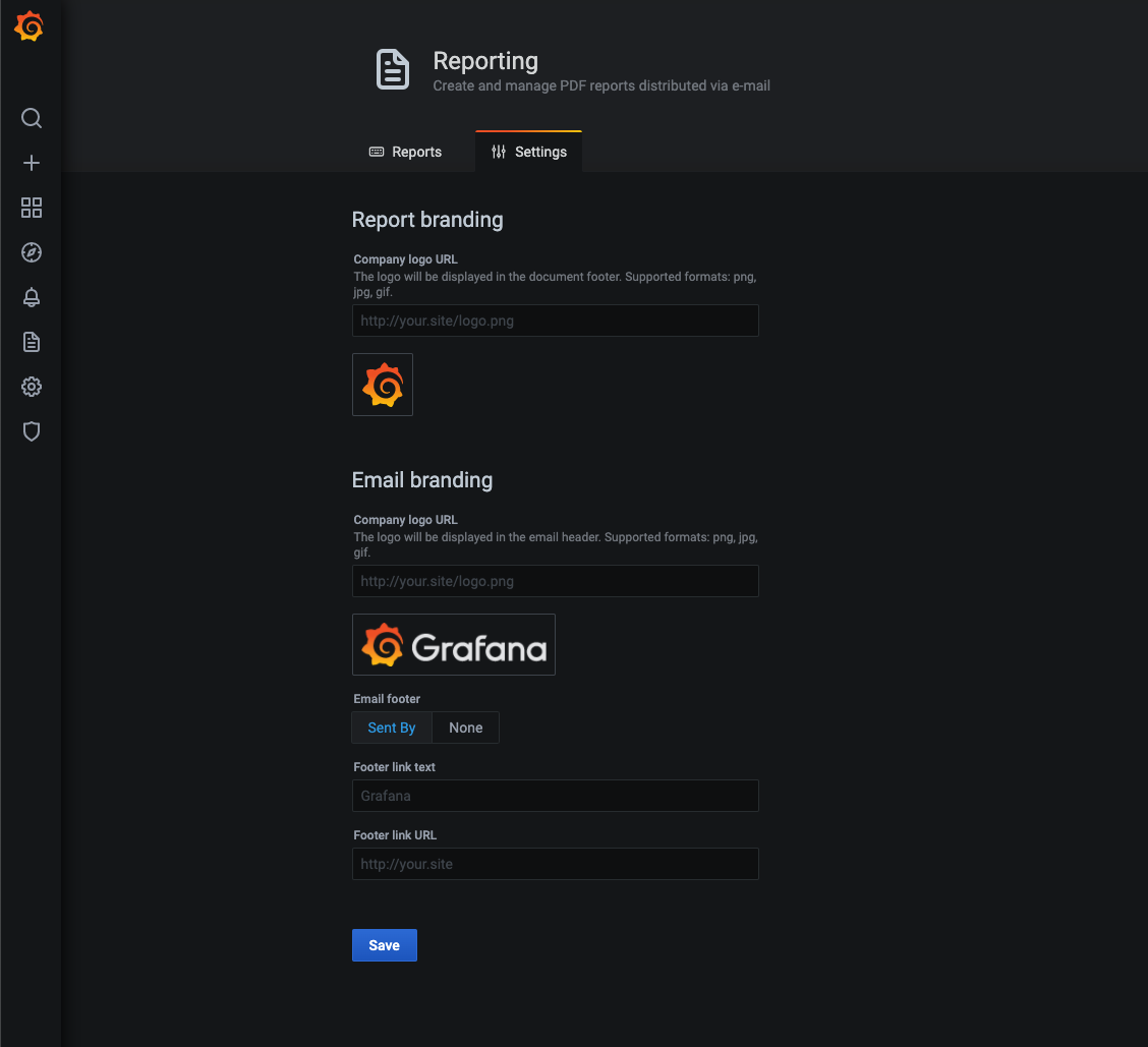 Report branding: Company logo URL - Company logo displayed in the report PDF. Defaults to the Grafana logo.