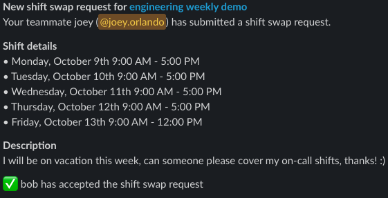 Upon submitting the request, a Slack notification will be sent to the channel associated to the correspondent schedule, if there is one. A mobile push notification will be sent to team members who participate in the schedule and have the notifications enabled.